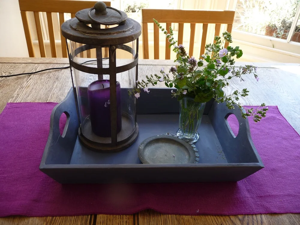 Delicate sprigs of herb flowers on the kitchen table. I painted this tray in Annie Sloan 'Old Violet.