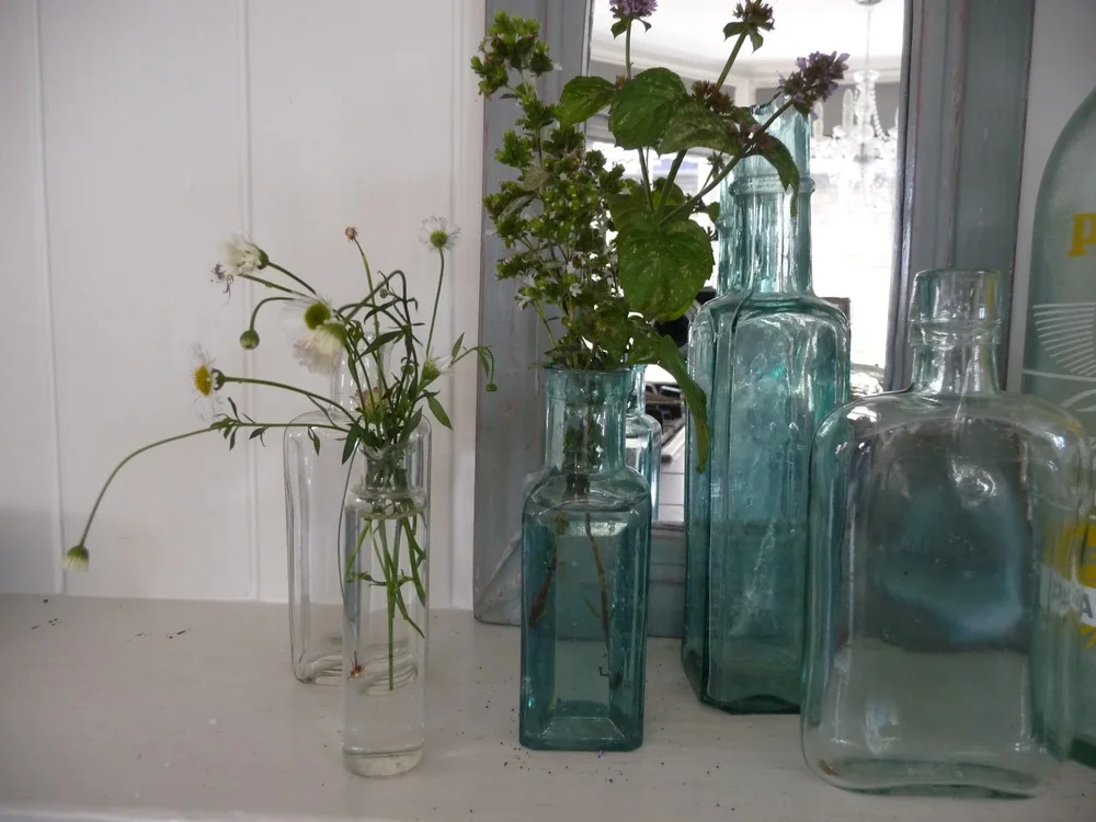 I bought this selection of inexpensive, old bottles from Phoenix on Golborne. Jess, the owner has a lovely eclectic mix of furniture and smaller items. This is one of my favourite shops and it's where I did my paint class. In the green bottle are stems of mint, marjoram and oregano. The other bottle contains tiny daisies that some people would consider a weed!